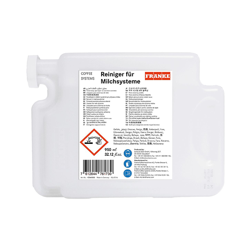 Vloeibare reiniger in handige cartridge voor het automatisch reinigen van Franke-melksystemen. Verwijdert melk- en eiwitresten, voorkomt geurtjes en houdt de schuimkwaliteit constant.